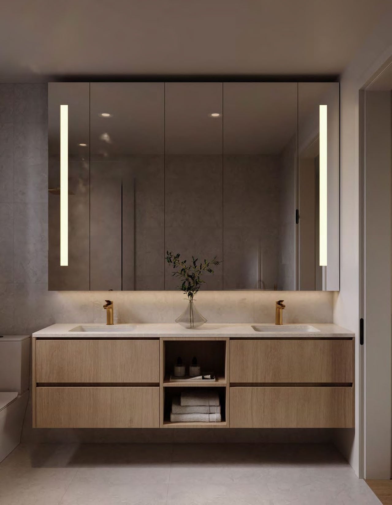 - Spa-Inspired Bathrooms: Floating vanities, warm wood tones, quartz countertops, brushed gold fixtures, and select soaker tubs